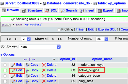 You need to click on the wp_options table. Inside wp_options table you will see rows of different options. You will need to find the option ‘active_plugins’ and then click on the ‘Edit’ Link next to it.
