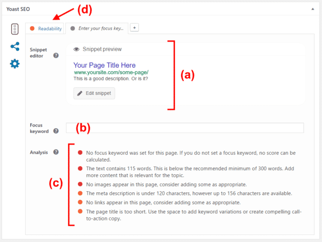 - Page analysis. Before you publish a post, it checks images to make sure they have alt tags that contain a focus keyword. It also checks whether the post is long enough and whether you’ve written a meta description with a focus keyword.
