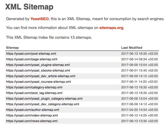 The XML sitemap above shows the XML sitemap of the Yoast website, which the Yoast SEO plugin created. If you read further down the article, we’ll explain exactly how our plugin helps you create the best XML sitemaps. If you’re not using our plugin, your own XML sitemap looks a bit different but it will work the same.